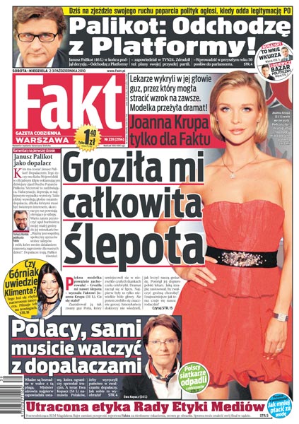 Dziś Janusz Palikot ogłosi, kiedy odda legitymację PO i założy własne ugrupowanie; modelce Joannie Krupie groziła ślepota; znani politycy i posłowie wspominają swoje lata nauki; wielki powrót Kasi Cichopek; Manuel Arboleda wciąż nie przedłużył kontraktu z Lechem Poznań; po sromotnej klęsce z Bułgarią polscy siatkarze wracają z mistrzostw świata z niczym; cała prawda o urodzie Madonny.