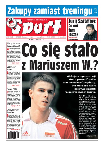 Mariusz Wlazły, atakujący polskiej reprezentacji siatkarskiej, stracił pewność siebie oraz mentalność zwycięzcy; Franciszek Smuda z powodu przemęczenia swoich zawodników odwołał środowe zajęcia; Wisła Kraków zanotowała najsłabszy start w lidze od kiedy rządy w klubie przejął Bogusław Cupiał; Hiszpanie mają sporo do udowodnienia w meczach z Litwą i Szkocją; działacz Odry Wodzisław zamieszany w poważną aferę korupcyjną.