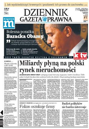 Zagraniczni inwestorzy wykupują nasze biurowce, magazyny i centra handlowe, tylko jeden brytyjski fundusz chce wydać w Polsce pół miliarda złotych; skarbówka znalazła świetny sposób na nękanie długimi kontrolami firm, problem w tym, że jest bezprawny; ani rząd, ani opozycja nie są dziś gotowe do odważnego reformowania finansów publicznych; bolesna porażka prezydenta USA Baracka Obamy; wielkie oszustwo w prywatnych szkołach dla dorosłych; Millennium i BRE Bank mogą wkrótce zostać wystawione na sprzedaż.