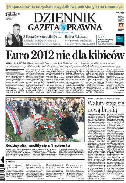 Tysiące osób, które przyjadą do Polski na mistrzostwa Europy, utkną w korkach albo na nieremontowanych liniach kolejowych, za to po nowych drogach poruszać się będą telewizyjne wozy transmisyjne; podatkowe konsekwencje inwestycji w obcych środkach trwałych; do 22 października przedsiębiorcy usługowo prowadzący księgi rachunkowe powinni przeprowadzić ocenę ryzyka wszystkich klientów; zawiadomienie o wszczęciu postępowania egzekucyjnego, które zawiera błędy, umożliwia podatnikowi uchylenie się od zapłaty zaległego podatku; od 1 stycznia 2011 r. fakturę będzie można przesłać w pliku PDF e-mailem lub faksem.