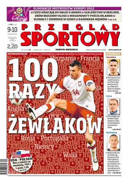 Michał Żewłakow w meczu z USA zagra po raz setny w narodowych barwach – wywiad z kapitanem naszej reprezentacji; Marcin Wasilewski po sześciu operacjach i rocznej przerwie wraca do gry; dziś w Bydgoszczy Jarosław Hampel powalczy o srebrny medal w indywidualnych mistrzostwach świata, a Tomasz Gollob zrobi wszystko, żeby tylko wystąpić przed polską publicznością; ruszyła Tauron Basket Liga – vademecum koszykarskiej ekstraklasy; co się działo w meczach eliminacji Euro 2012; w półfinałach siatkarskich mistrzostw świata najwięcej emocji wywołuje mecz Brazylijczyków z gospodarzami turnieju; w niedzielnym starciu z THW Kiel Vive Targi Kielce jest skazywane na pożarcie; Justyna Kowalczyk trenuje już na śniegu; dobre treningi Roberta Kubicy na torze Suzuka w Japonii.