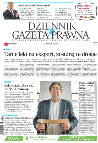 Rząd wprowadza ograniczenia w legalnym wywozie za granicę drogich produktów znanych koncernów, ale ich tańsze zamienniki będzie można eksportować swobodnie - efekt: pacjenci zostaną skazani na kosztowne oryginały; dzieciom, które we wrześniu pójdą do pierwszej klasy, nauka będzie się kojarzyć głównie ze zmęczeniem i przepełnionymi świetlicami - praca na dwie zmiany do godz. 17 to niemal standard; Synthos kontrolowany przez Michała Sołowowa i Ciech Jana Kulczyka zmierzą się z sobą i zagraniczną konkurencją w pojedynku o rynek środków ochrony roślin; rozmowa z Piotrem Voelkelem, założycielem Grupy VOX Meble.