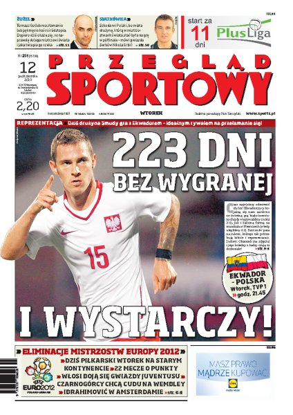 Dziś drużyna Franciszka Smudy zagra w Kanadzie z Ekwadorem – idealnym rywalem na przełamanie się po długiej serii bez zwycięstwa; wywiad z Arturem Borucem, bramkarzem numer 1 w polskiej reprezentacji; analiza przedmeczowa najciekawszych spotkań eliminacji do Euro 2012; Tomasz Gollob, najlepszy żużlowiec globu, nie myśli o kontuzjowanej nodze, ale o drugim zwycięstwie w cyklu Grand Prix; ile wart jest trzeci z rzędu tytuł mistrzowski, jaki wywalczyli brazylijscy siatkarze.