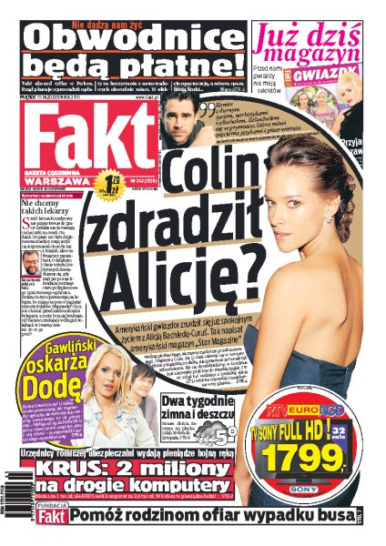Taki absurd może mieć miejsce tylko w Polsce – rząd planuje wprowadzić opłaty za korzystanie z autostradowych obwodnic miast; Colin Farrell znudził się już spokojnym życiem u boku Alicji Bachledy-Curuś i wszystko wskazuje na to, że ją zdradził; Robert Gawliński oskarża Dodę, że wykorzystuje chorobę ukochanego Nergala, aby się promować; zobacz, jak możesz pomóc rodzinom ofiar tragicznego wypadku busa, w którym zginęło 18 osób; KRUS kupuje nowe komputery za dwa mln zł.