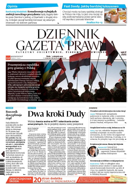 Dziennik Gazeta Prawna – codziennie obiektywne i rzetelne informacje z kraju i ze świata. Piszemy o tym, co dziś ważne i odpowiadamy na Wasze pytania – szczególnie te związane z obecnymi wyzwaniami tj. pandemia, praca zdalna. Na bieżąco wyjaśniamy zmieniające się przepisy. Wspieramy się wyjaśnieniami ministerstw i urzędów. Pomagamy unikać błędów i ostrzegamy, jakie są kary. Ponadto w każdy piątek specjalne magazynowe wydanie Dziennika Gazety Prawnej w całości z tekstami społeczno-ekonomicznymi.