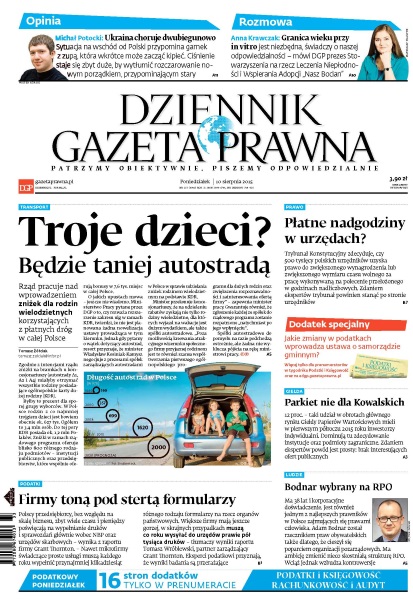 Sytuacja na wschód od Polski przypomina garnek z zupą, która wkrótce może zacząć kipieć - ciśnienie staje się zbyt duże, by wytłumić rozczarowanie nowy porządkiem, przypominającym stary; granica wieku przy in vitro jest niezbędna, świadczy o naszej odpowiedzialności; rząd pracuje nad wprowadzeniem zniżek dla rodzin wielodzietnych korzystających z płatnych dróg w całej Polsce; Trybunał Konstytucyjny zdecyduje, czy 500 tysięcy polskich urzędników uzyska prawo do zwiększonego wynagrodzenia lub zwiększonego wymiaru czasu wolnego za pracę wykonywaną na polecenie przełożonego w godzinach nadliczbowych; 12 proc. - taki udział w obrotach głównego rynku Giełdy Papierów Wartościowych mieli w pierwszym półroczu 2015 roku inwestorzy indywidualni; polscy przedsiębiorcy, bez względu na skalę biznesu, zbyt wiele czasu i pieniędzy poświęcają na wypełnianie druków i sprawozdań głównie wobec NBP oraz urzędów skarbowych – wynika z raportu firmy Grant Thornton.
