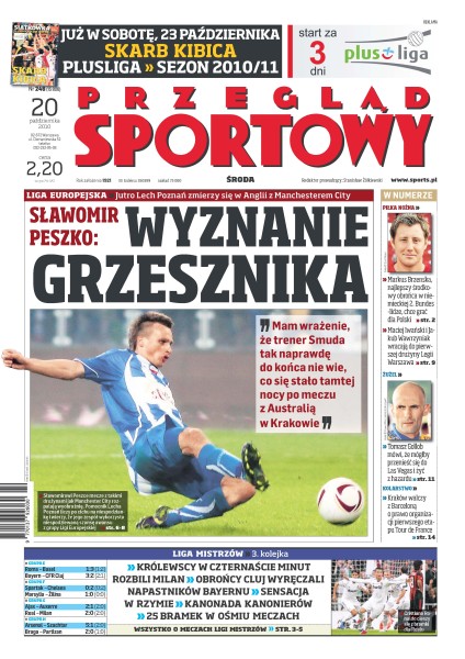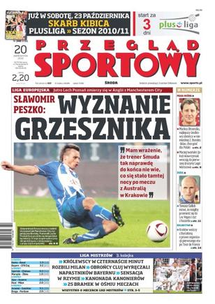 Jutro Lech Poznań zmierzy się w Anglii z Manchesterem City; Real Madryt pokonał AC Milan 2:0; Samuel Eto’o jest już trzykrotnym triumfatorem Ligi Mistrzów; Sławomir Peszko opowiada, że to mecze w Lidze Europejskiej rozpalają wyobraźnię jego i kolegów z Lecha; Aleksander Kwiek, strzelec zwycięskiego gola w spotkaniu z krakowską Wisłą robi rachunek sumienia; wkrótce na rynek trafi książka odsłaniająca kulisy kariery Tomasza Golloba i całej dyscypliny; Justyna Kowalczyk jest zadowolona z treningów na wysokości 2 tys. 700 metrów na Dachsteinie.