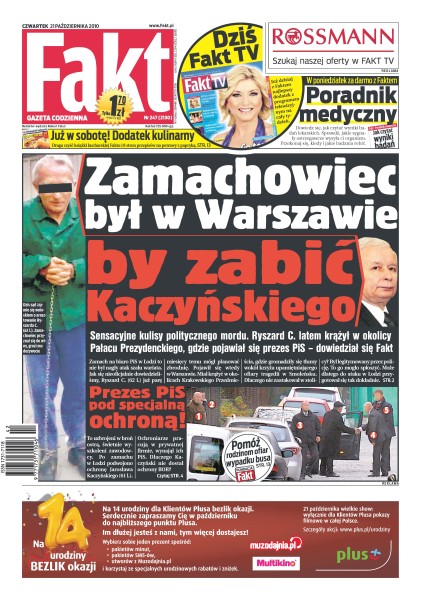 Sensacyjne kulisy politycznego mordu – Ryszard C. latem krążył w okolicy Pałacu Prezydenckiego, gdzie pojawiał się prezes PiS; zaledwie kilka godzin po ataku w Łodzi prezes PiS dostał podwójną ochronę; Ryszard Kalisz i Wojciech Olejniczak spotkali się w warszawskiej kawiarni; prawie 300 uczniów było w klasach, gdy płomienie objęły gimnazjum w Sianowie; Edyta Herbuś wie, jak zadbać o swoją figurę; już niebawem Andrzej Łapicki pojawi się na planie najpopularniejszej polskiej telenoweli; Julia Kamińska wróciła na studia; kibice Justyny Kowalczyk będą musieli przyzwyczaić się do nowych kolorów swojej ulubienicy.