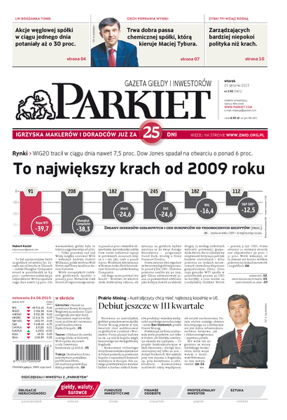 Największy w Polsce newsroom gospodarczy zbiera, analizuje i zgłębia dla Państwa najważniejsze informacje ze świata finansów. Codzienne wydanie „Parkietu”, sześć dni w tygodniu, to kilkadziesiąt artykułów o emitentach, instytucjach finansowych, gospodarce. To również opinie, felietony i wywiady z najważniejszymi ludźmi krajowej i globalnej finansjery.