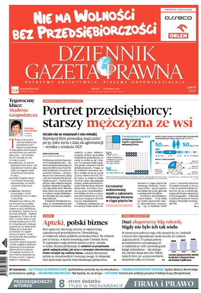Z sondażu DGP wynika, że najwięcej firm prowadzą wcale nie w miastach i nie młodzi, ale mężczyźni po 55. roku życia z dala od aglomeracji; apteki, polski biznes; duzi eksporterzy biją rekordy: nigdy nie było ich tak wielu; licytacja za pieniactwo: spółdzielnia zemściła się na mieszkańcu; zmiana procedury karnej: sędzia śledczy skontroluje prokuratora i policję; ochrona dworców: nie będzie, bo za drogo; wywiad: kosmiczne ambicje prezesa Polskiej Grupy Zbrojeniowej.