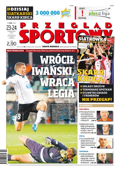 Legia Warszawa wysoko pokonała Koronę Kielce, natomiast Polonia Bytom rozegrała remisowe spotkanie ze Śląskiem Wrocław; wywiad z Tomaszem Kuszczakiem; Tomasz Gollob otrzymał propozycje występów z trzech szwedzkich klubów; rozmowa z Jackiem Nawrockim, trenerem Skry Bełchatów, o polskiej reprezentacji siatkarskiej.
