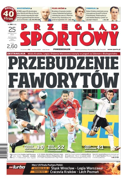 Kolejorz znów pokazał inną twarz niż w europejskich pucharach przegrywając z Górnikiem 0:2; Wisła Kraków, Legia i Polonia ruszyły w pogoń za liderem z Białegostoku; Borussia Dortmund po remisie 1:1 z Hoffenheim spadła na drugie miejsce; bezbłędny występ Łukasza Fabiańskiego, Kanonierzy gromią najbogatszy klub Premier League 3:0; Robert Kubica dojechał piąty w nietypowym wyścigu na nowym torze Yeongam; Zastal Zielona Góra po dogrywce wygrał w Poznaniu 84:79 i po trzech kolejkach jest niepokonany; w ringu można zginąć lub zostać kaleką – mimo badań i rygorystycznych przepisów wypadki będą się zdarzać.