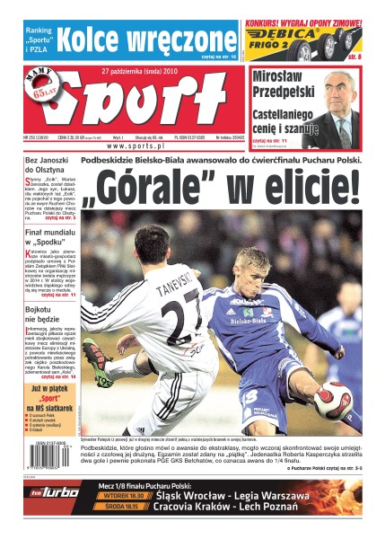Podbeskidzie Bielsko–Biała awansowało do ćwierćfinału Pucharu Polski; dyrektor sportowy Tomasz Wałdoch mówi o zachowaniu Arboledy, murawie na Roosevelta i obecnej sytuacji w drużynie; nie wszystkie roszady trenerów dokonane przez działaczy w klubach pierwszoligowych były trafnymi decyzjami; problemy Feyenoordu są znane od dłuższego czasu, a po klęsce w Eindhoven sytuacja drużyny sięgnęła dna; gorąco prosiliśmy Daniela Castellaniego, żeby przygotował plan na przyszłość – takiego jednak nie było – mówi prezes PZPS; celem koszykarek Wisły Can Pack Kraków znów jest awans do turnieju finałowego, a Lotosu Gdynia i AZS Gorzów Wlkp. – zakwalifikowanie się do fazy play off.