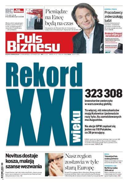 Pracodawcy znów szukają ludzi – potrzeba doświadczonych inżynierów i menedżerów w produkcji i budownictwie; eksperci Europejskiego Banku Odbudowy i Rozwoju podnieśli prognozy dla Polski i wielu innych państw Europy Środkowej i Wschodniej; dlaczego walka o ostatnie w tym roku unijne dotacje dla firm produkcyjnych będzie zacięta; siecią bankomatów interesuje się portugalski SIBS; najbogatszy Polak dostał tydzień na dopięcie kredytów na zakup Enei; telewizja Puls ma pomysł i szuka partnera z treścią; 323 tys. Polaków przejmuje warszawską giełdę – takiego popytu nie było przy dużo większych ofertach Tauronu i PZU.