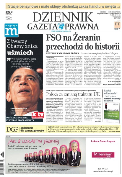 Stacje benzynowe i małe sklepy obchodzą zakaz handlu w święta; FSO na Żeraniu po 60 latach pracy kończy działalność; nasz kraj zgadza się na forsowane przez Niemcy i Francję otwarcie traktatu lizbońskiego; budżety samorządów na 2011 r. będą tworzone według nowych, restrykcyjnych zasad; od nowego roku wzrosną stawki maksymalne podatku od nieruchomości; jakie samochody ciężarowe są objęte minimalną stawką podatku; transakcja przejęcia polskiego banku przez hiszpańskiego Santandera budzi coraz więcej wątpliwości; resort finansów negocjuje umowy o unikaniu podwójnego opodatkowania; czy w 2011 roku wzrosną stawki podatku od domów i mieszkań.