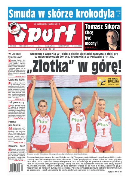 Meczem z Japonią w Tokio polskie siatkarki zaczynają dziś grę w mistrzostwach świata; Franciszek Smuda irytuje się, że dziennikarze koncentrują się na negatywach jego pracy z kadrą; Tomasz Frankowski i Paweł Janas nie rozmawiali ze sobą od czterech lat; pochodzący z Bydgoszczy 33–letni Robert Wulnikowski był bohaterem meczu z Borussią Dortmund; zwycięstwem nad Ukrainą biało–czerwoni uczcili 150 mecz pod wodzą Bogdana Wenty; tylko przez pięć pierwszych minut gdynianki potrafiły nawiązać walkę z Euroleasingiem Sopron; już tylko niecały miesiąc pozostał do rozpoczęcia rywalizacji w Pucharze świata w skokach narciarskich.