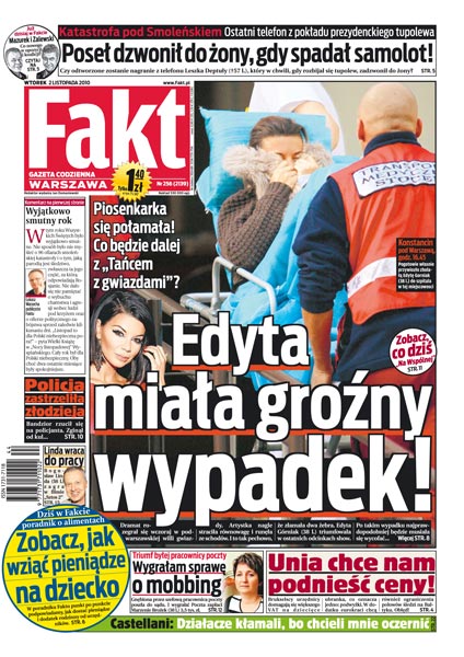 Ostatni telefon z pokładu prezydenckiego tupolewa: poseł dzwonił do żony, gdy spadał samolot; w strzelaninie na parkingu policja zastrzeliła złodzieja samochodów; była pracownica poczty wygrała sprawę o mobbing; poradnik o alimentach; Edyta Górniak połamała się – co będzie z jej występami w „Tańcu z gwiazdami”; brukselscy urzędnicy domagają się wyższej stawki VAT na dziecięce ubranka; Bogusław Linda wraca do pracy – zagra w filmie Olafa Lubaszenki; Weronika Książkiewicz zdradza, że trzyma formę dzięki dziecku; Daniel Castellani twierdzi, że siatkarscy działacze kłamali, chcąc go oczernić; Legia funduje kibicom piłkarskim horrory; siatkarki przegrały dwa z trzech meczów mistrzostw świata.