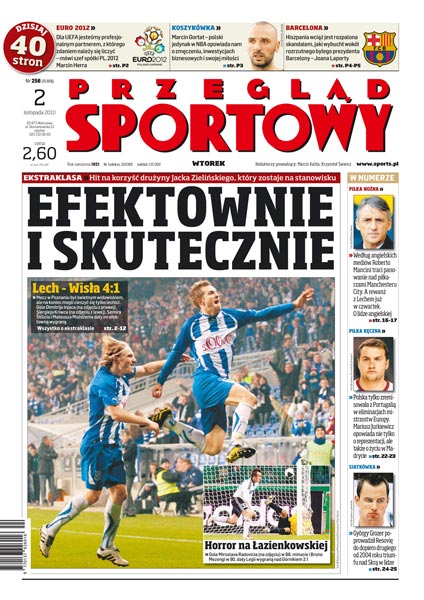 Hit piłkarskiej Ekstraklasy – mecz Lecha z Wisłą – zakończył się wysokim zwycięstwem poznaniaków; dreszczowiec przy Łazienkowskiej: Legia wygrała przegrany mecz; polskie siatkarki wygrały tylko jeden z trzech meczów w czasie mistrzostw świata; czy Roberto Mancini, trener Manchesteru City, z którym Lech Poznań zmierzy się w najbliższy czwartek, traci panowanie nad piłkarzami; Polska tylko zremisowała z Portugalią w eliminacjach mistrzostw Europy w piłce ręcznej; Resovia dopiero po raz drugi w ciągu sześciu lat pokonała Skrę w lidze; wywiad z Marcinem Herrą, szefem spółki PL.2012; Marcin Gortat opowiada o zmęczeniu, inwestycjach biznesowych i swojej miłości; Hiszpania wciąż jest rozpalona skandalem, jaki wybuchł wokół Joana Laporty, rozrzutnego byłego prezydenta Barcelony.