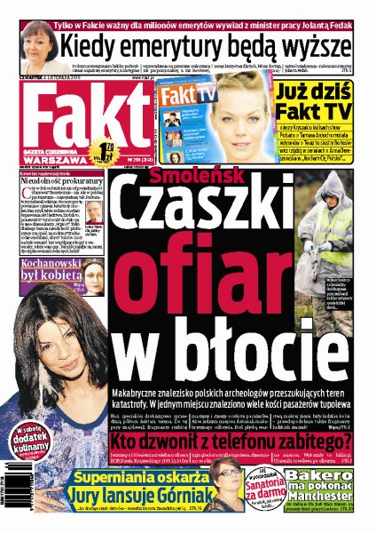 Makabryczne znalezisko polskich archeologów przeszukujących teren katastrofy prezydenckiego Tu-154, w jednym miejscu znaleziono wiele kości pasażerów samolotu; Ewa Kopacz ostrzega obywateli przed paleniem, a sama kopci jak smok; minister pracy Jolanta Fedak otwarcie przyznaje, że emerytury w Polsce są zdecydowanie za niskie; absurdalne przepisy w NFZ zamiast pomagać, jeszcze bardziej szkodzą chorym ludziom; skandal w programie „Taniec z gwiazdami”.